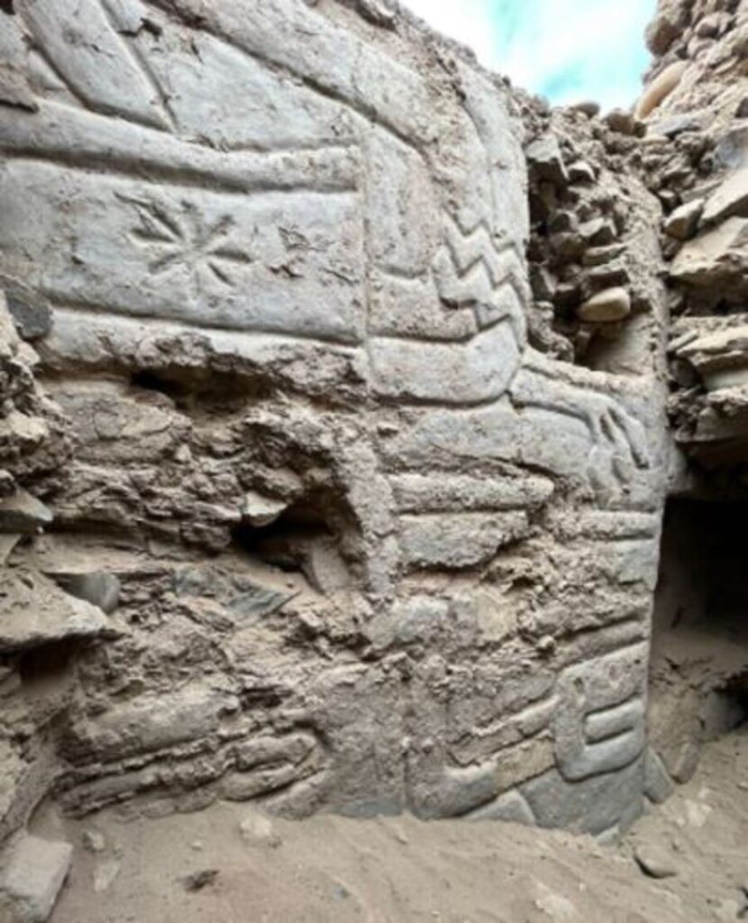 Unlike typical flat murals known from ancient Peru, the newly revealed wall is sculpted in both high and low relief, creating a dynamic, almost sculptural surface. Measuring approximately four meters in length and 1.5 meters in height, the mural forms part of an interior atrium within a U-shaped ceremonial temple—an architectural layout closely associated with early complex societies in the region.