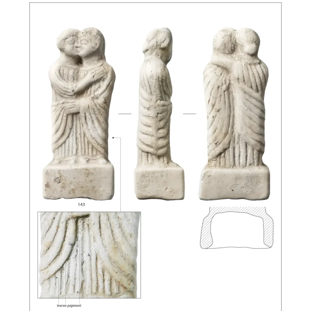 Among these burials, one stands out: the grave of a child under two years old. This burial contained a terracotta figurine depicting a couple embracing and kissing, widely interpreted as representing the child’s parents. The figurine likely symbolized protection or companionship in the afterlife. The grave also included miniature ceramic vessels, suggesting carefully structured ritual practices.