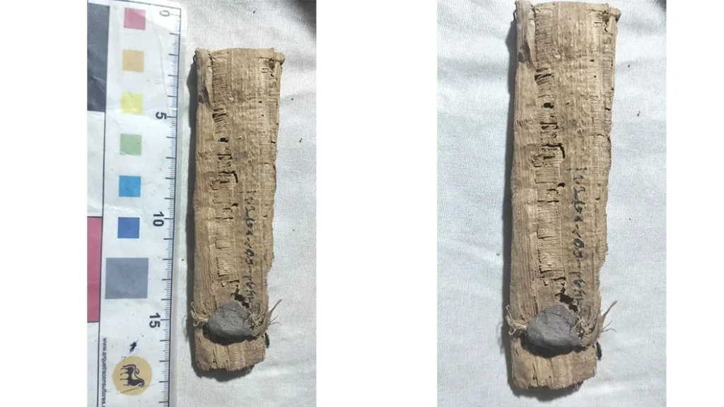 Perhaps even more intriguing are eight papyri discovered inside a large pottery vessel within the chamber. Several of these papyri remain sealed with their original clay closures intact. Their varying sizes and preserved seals indicate they were carefully deposited.
