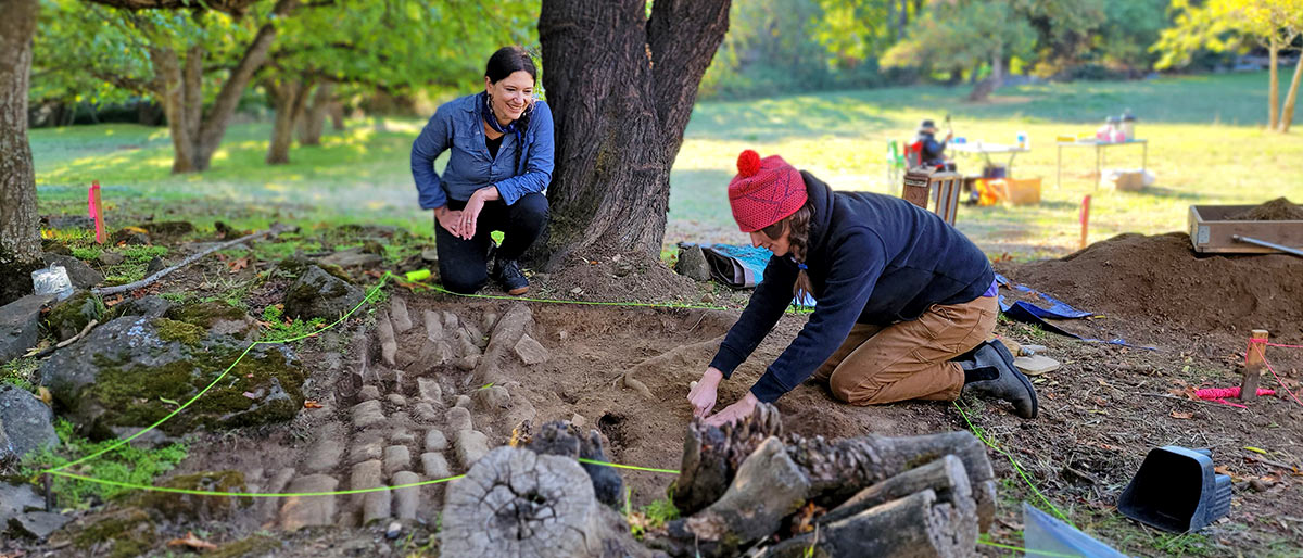 SOULA field school student Rebecca Chapman holds up a small ceramic fragment for inspection (R). Students Zoey Ahl and Victoria Mozdy learn from archaeologist Tyler Davis how to describe sediments using a Munsell soil color chart (L). Credit: Southern Oregon University Laboratory of Anthropology